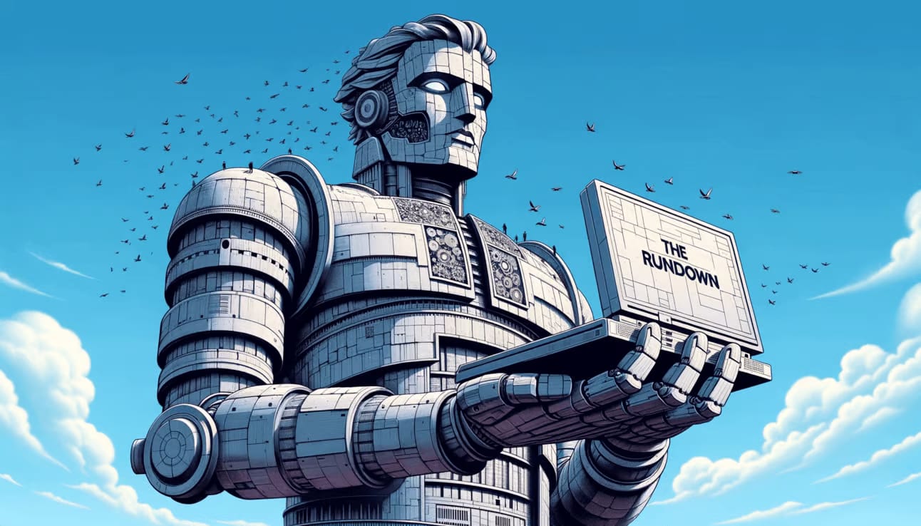 Ejemplo de indicación a continuación: una estatua gigante (como la Estatua de la Libertad), pero con un robot en lugar de una mujer, sosteniendo una computadora con el texto "The Rundown" grabado.